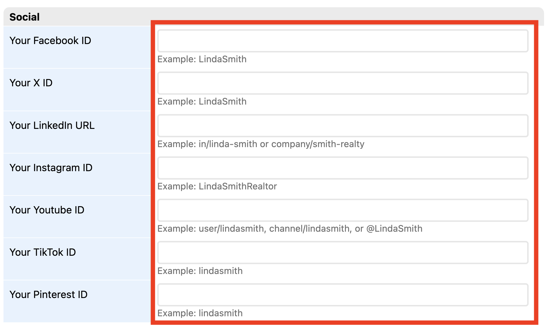 Social options will be displayed. Enter your social ids. Only social platforms that are filled in will be displayed on your website. See the example format below each field.